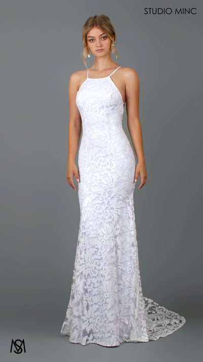 Allure - White Formal Dress, Satin Bra Cup Corset, Sequin Fitted Skirt, Leg Split