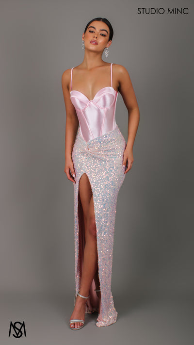Allure - Pink Formal Dress, Satin Bra Cup Corset, Sequin Fitted Skirt, Leg Split