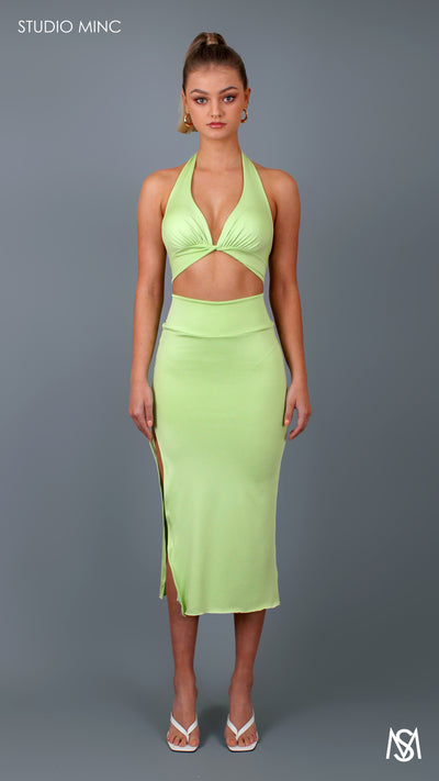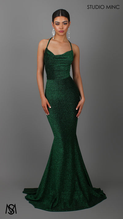 AURA - Emerald Green Shimmer Figure Flattering Formal Dress with Cowl Neckline