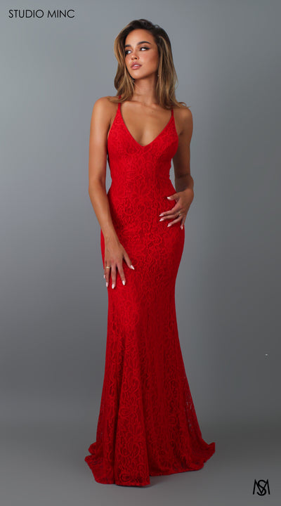 BELLE - Red Lace Formal Dress with Backless Lace Up