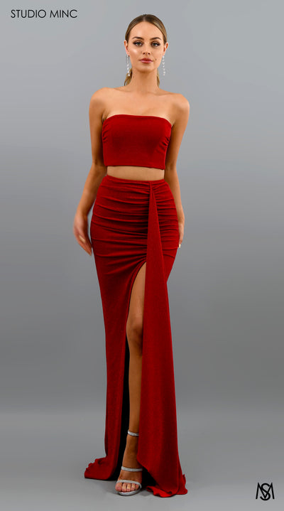 Rendezvous - Cherry Red Formal Dress, Sequin and beaded Cowl Plunge halter neck, fitted silhouette high leg slit