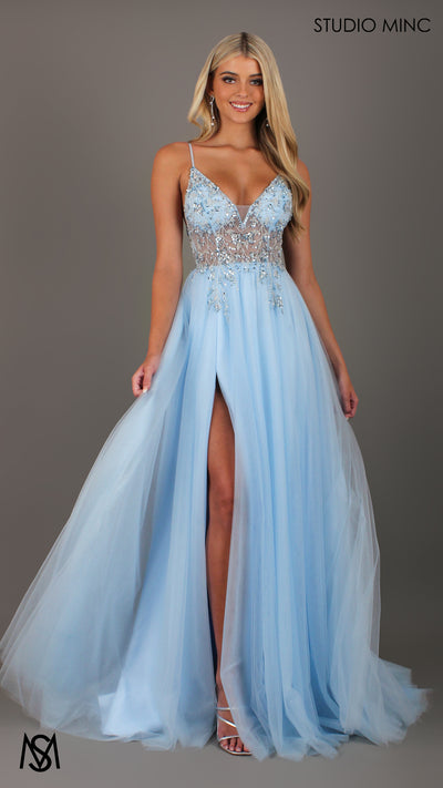 Lila - Light Blue Formal dress | Sheer Beaded floral V neckline tulle gown
