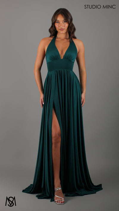 LOVE - Emerald Green Flowy Formal Dress with Plunge Neckline & Leg Split