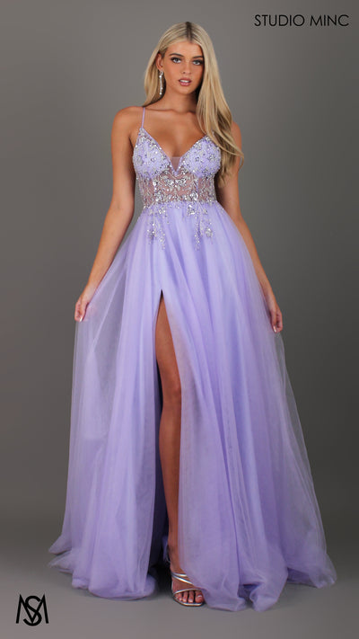 Lila - Lavender Purple Formal dress | Sheer Beaded floral V neckline tulle gown