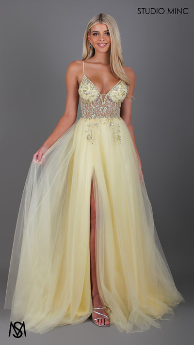 Lila - Light Yellow Formal dress | Sheer Beaded floral V neckline tulle gown