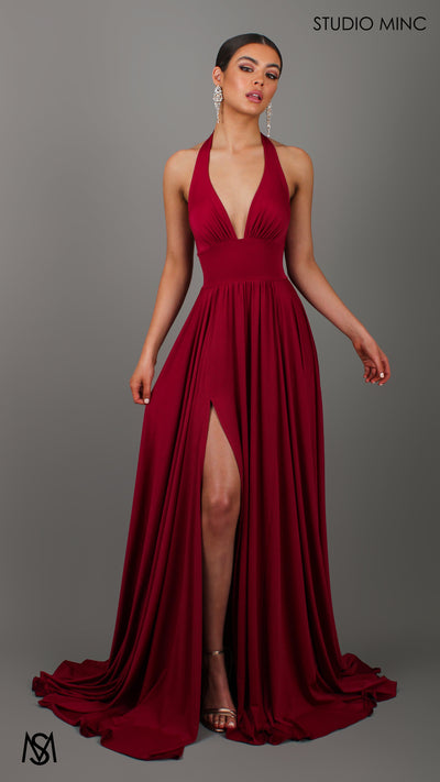 LOVE - Ruby Red Flowy Formal Dress with Plunge Neckline & Leg Split