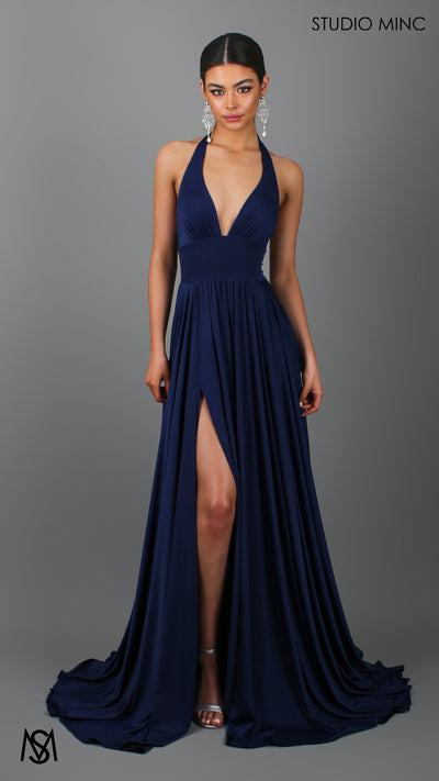 LOVE - Navy Blue Flowy Formal Dress with Plunge Neckline & Leg Split