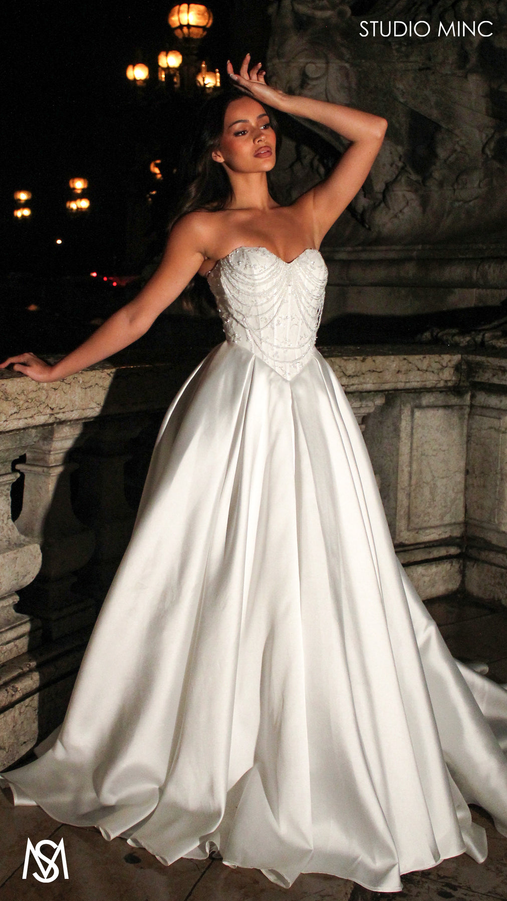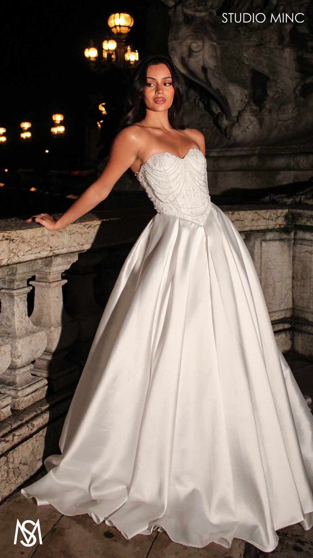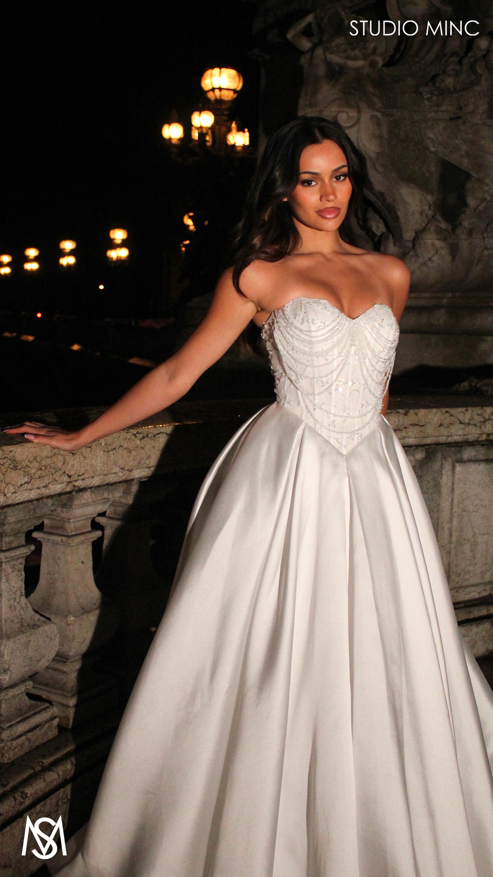 The Amelie Wedding gown is an upscale look that exudes glamour and elegance. The Amelie features an incredible corset bodice with delicate hand beading and a large mikado skirt with basque waist and tailored pleats. The Amelie is an unforgettable wedding dress.