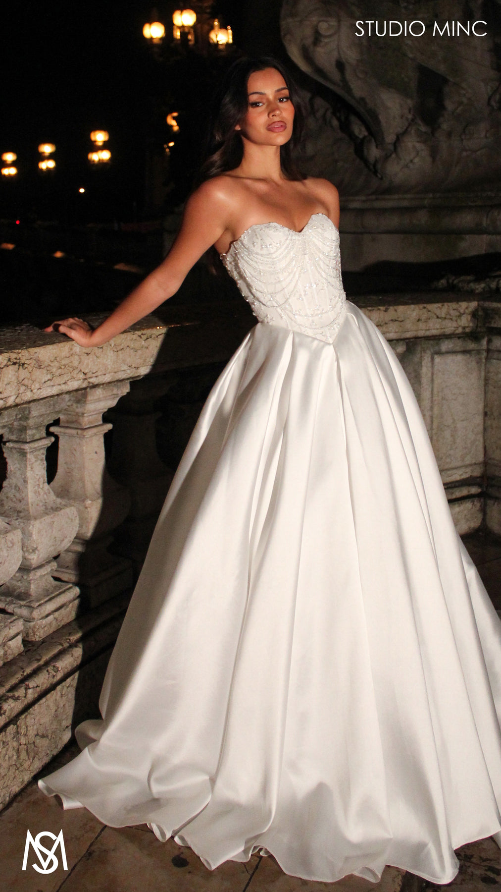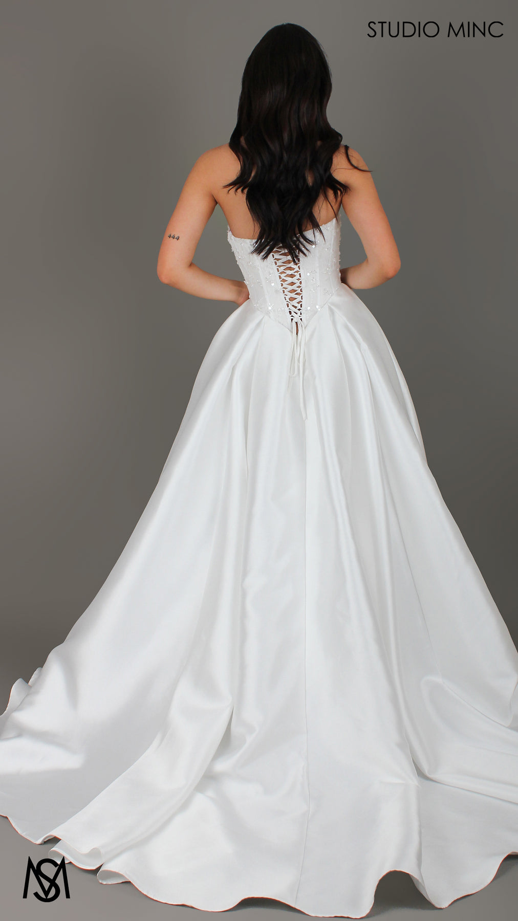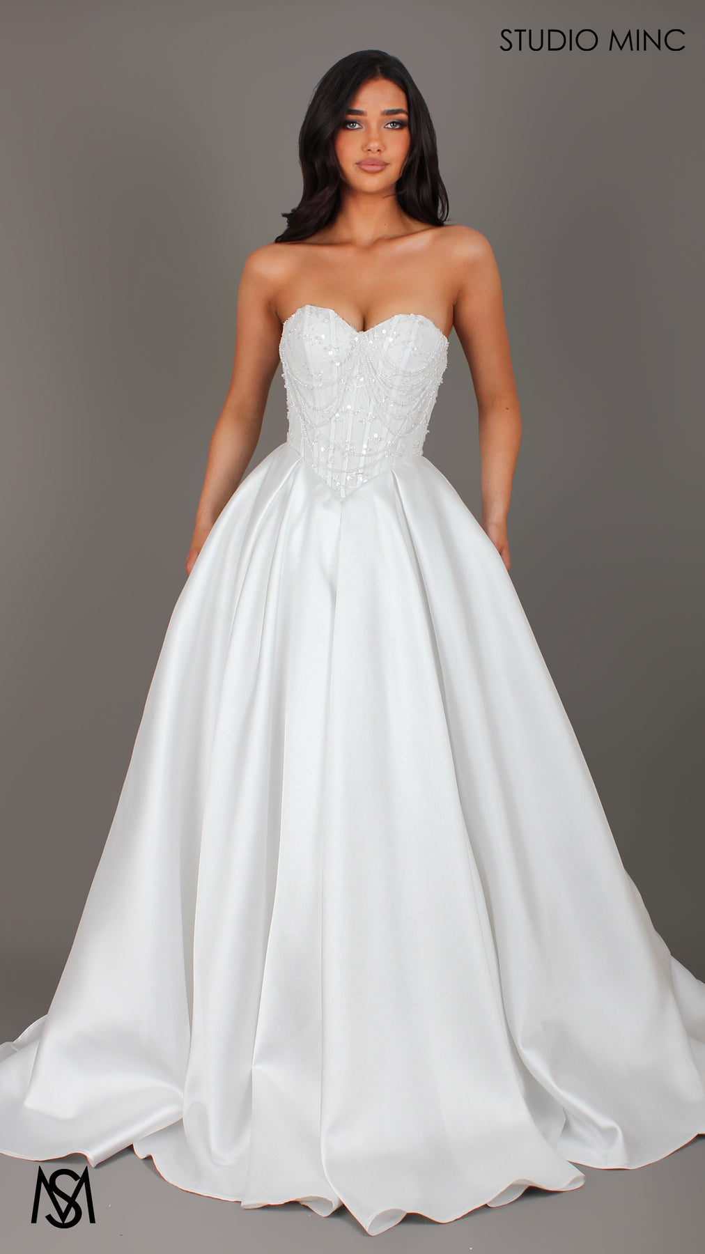 The Amelie Wedding gown is an upscale look that exudes glamour and elegance. The Amelie features an incredible corset bodice with delicate hand beading and a large mikado skirt with basque waist and tailored pleats. The Amelie is an unforgettable wedding dress.