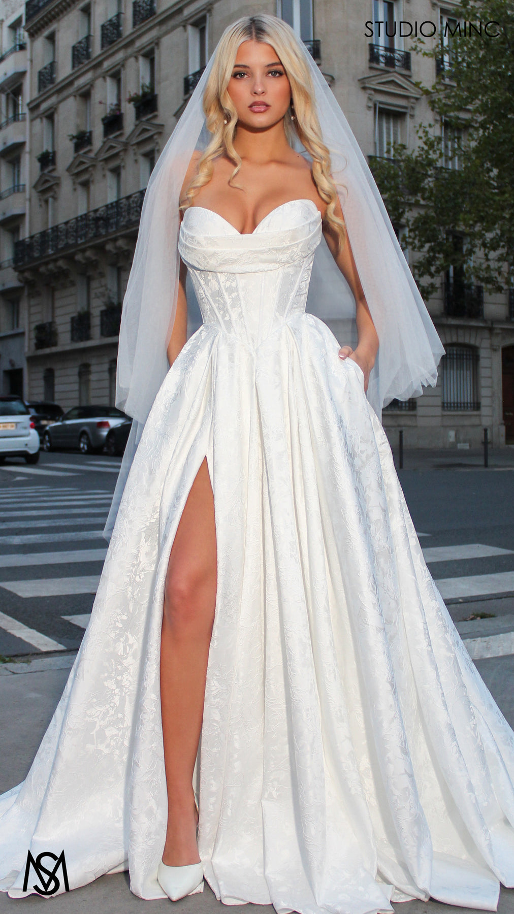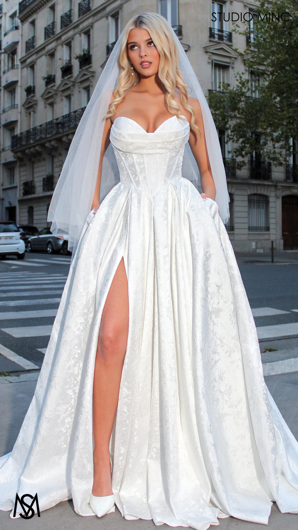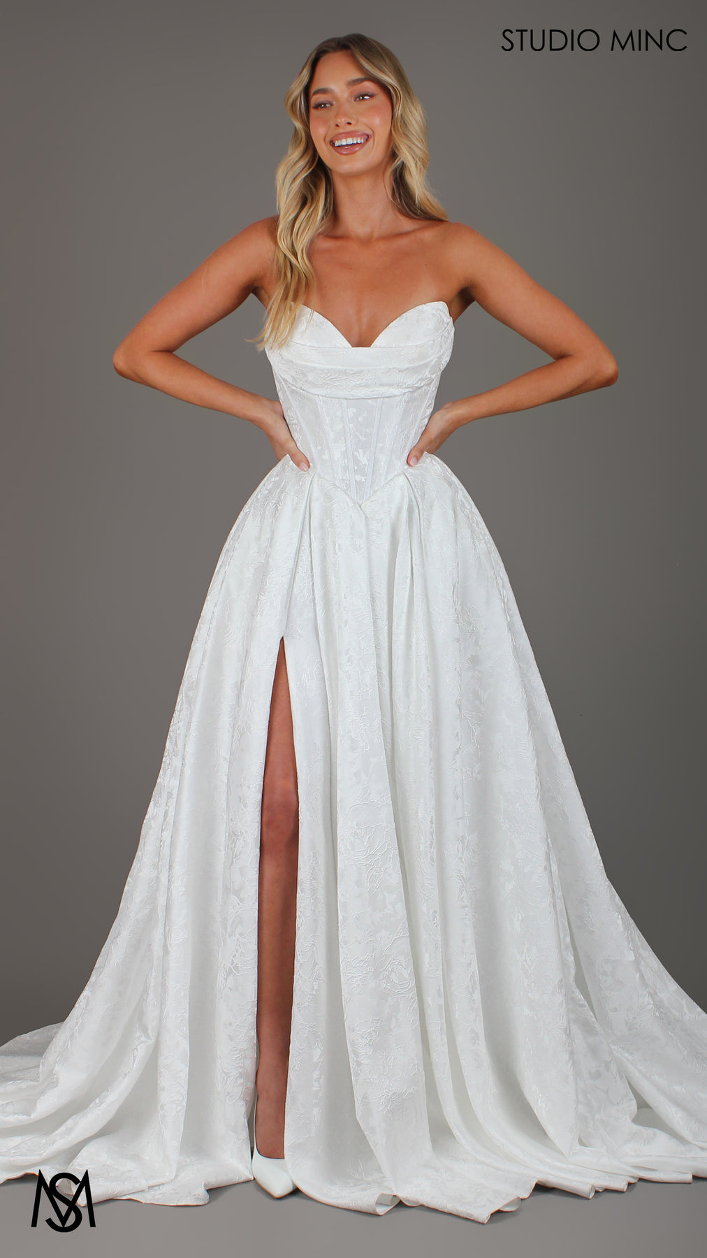 POSIE is a beautiful wedding dress with gorgeous embossed satin fabric! The strapless corset features bra cups with diagonal boning and drape design. The corset shape fits snuggly around the midsection with a striking basque waist detail. The skirt has inverted pleats with a leg slit and pockets!