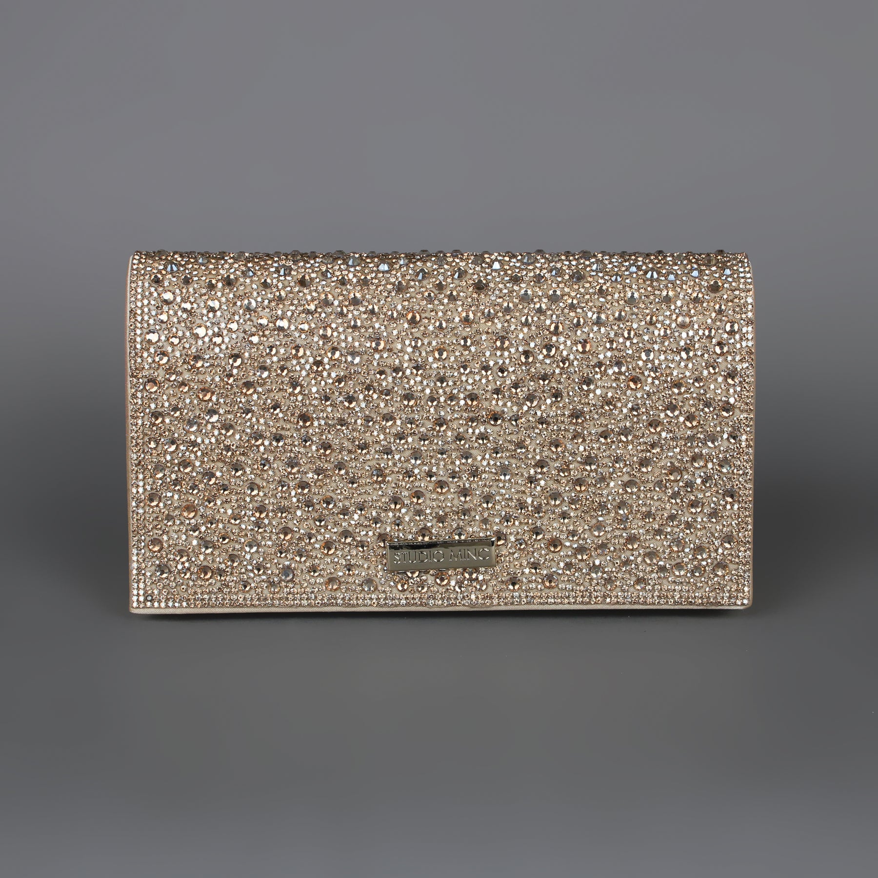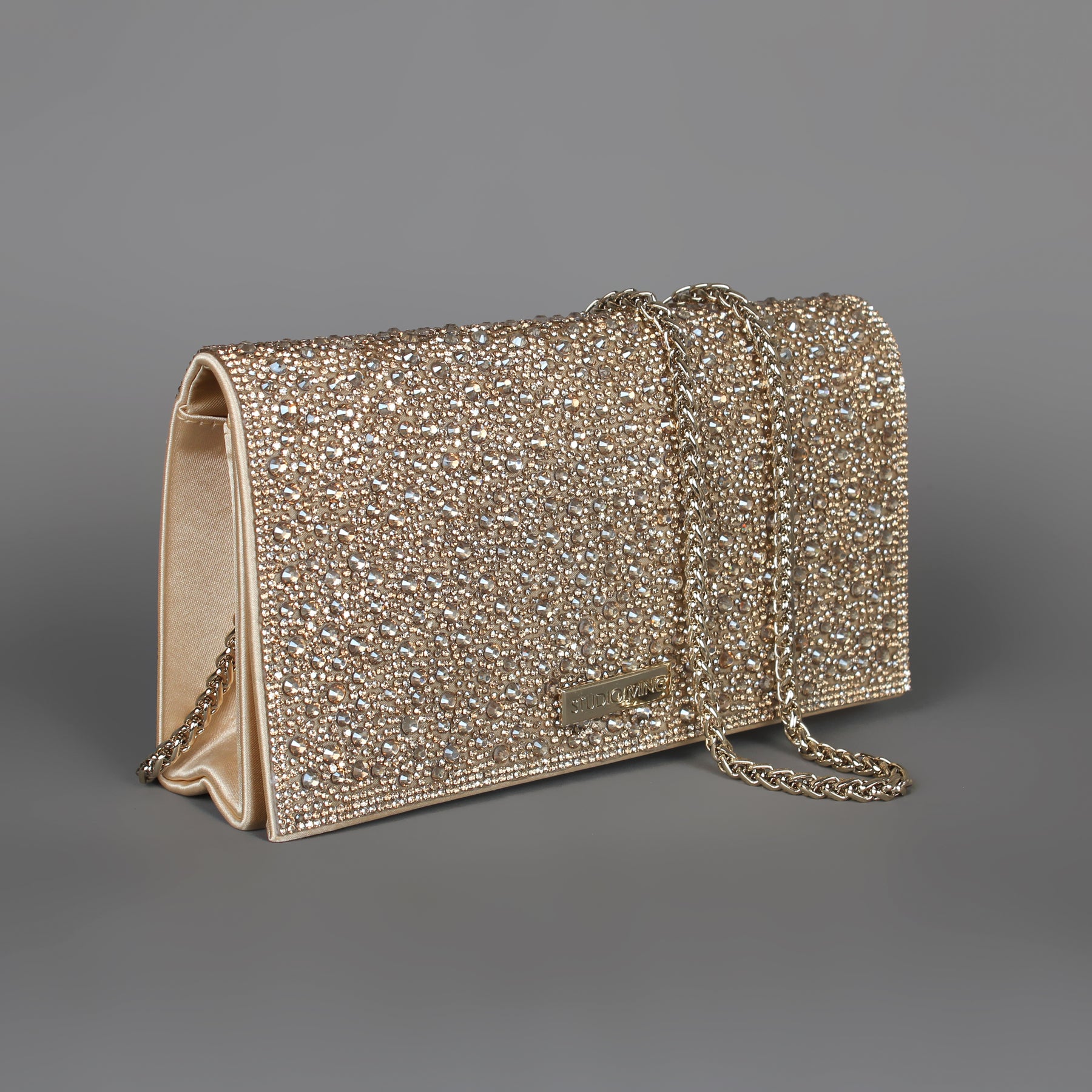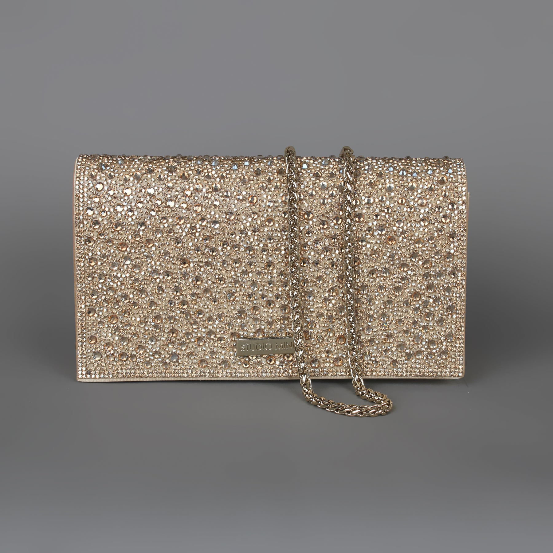 STUDIO MINC Rhinestone clutch with magnetic press stud closure and chain