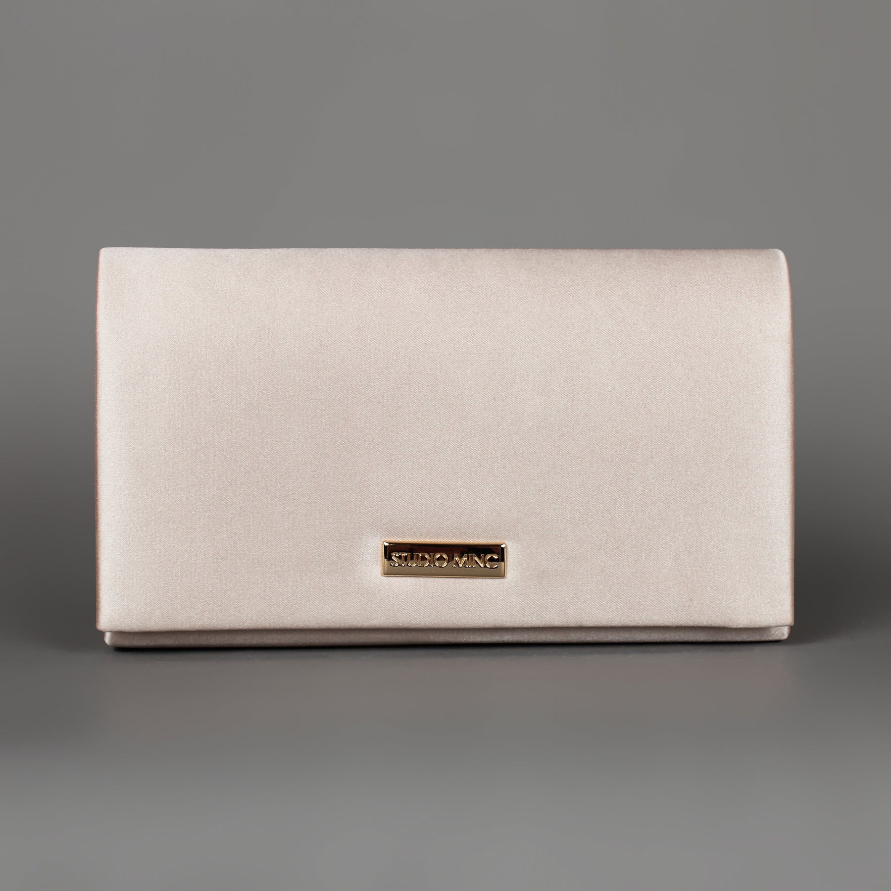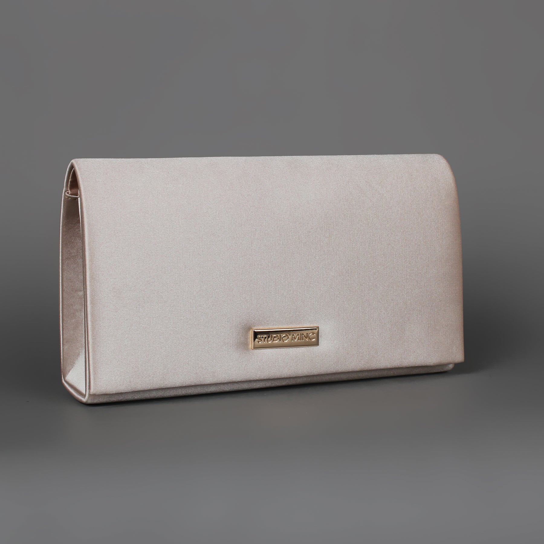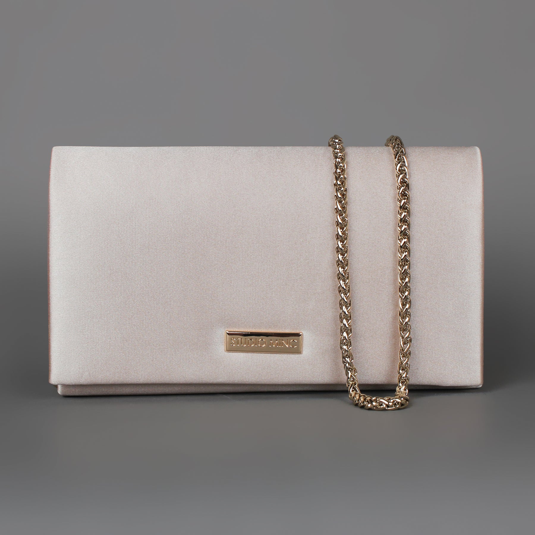 STUDIO MINC Satin clutch with magnetic press stud closure and shoulder chain.