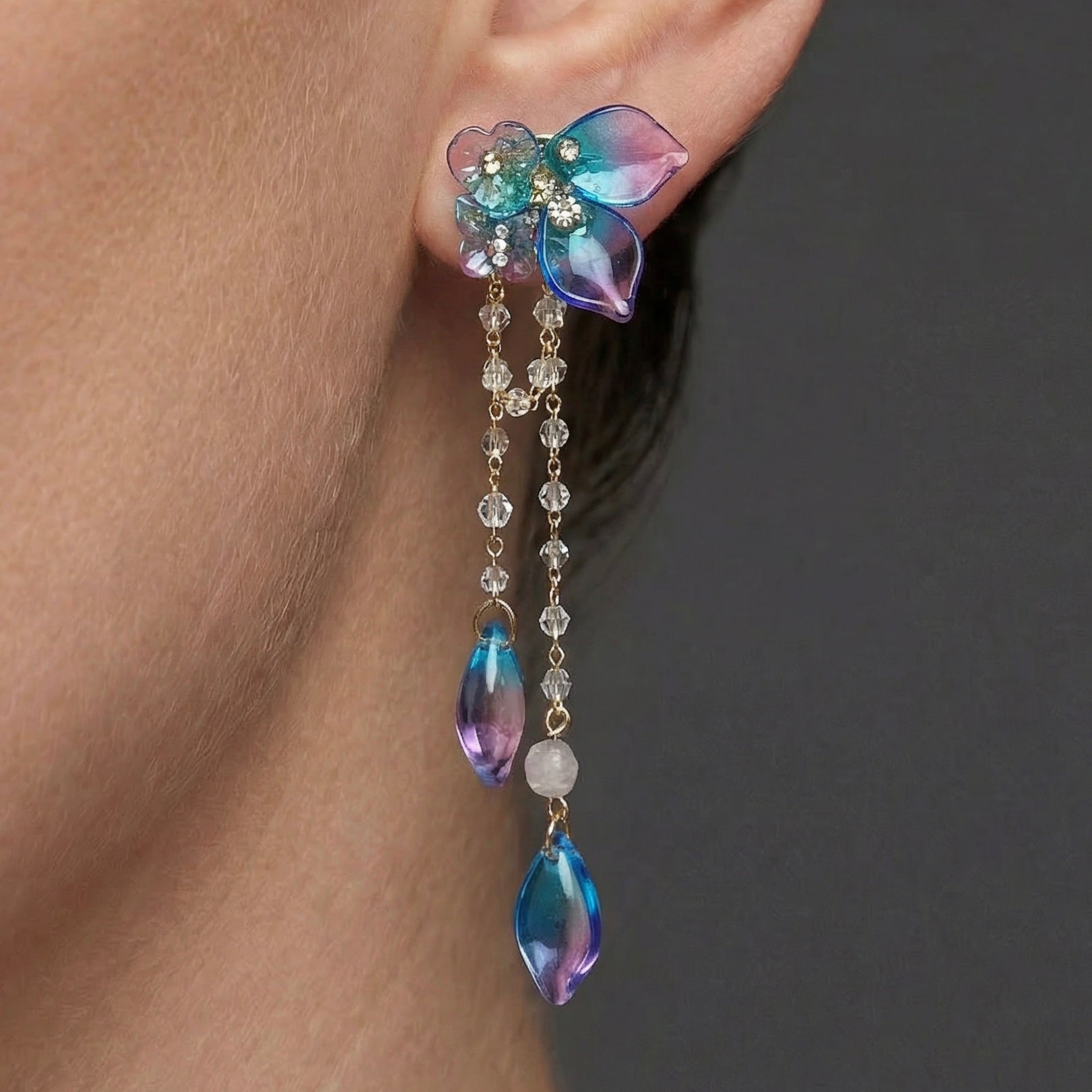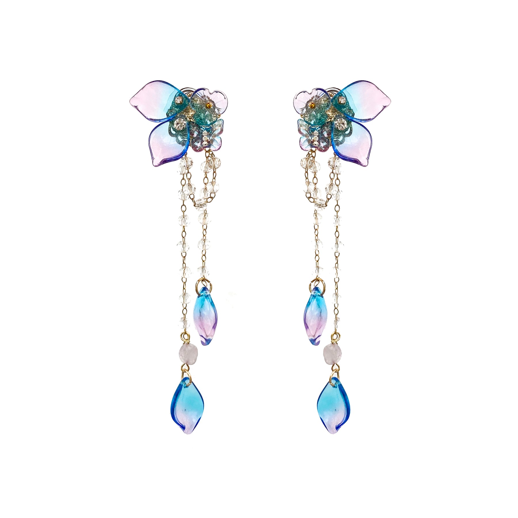 Regular price $45.00 AUD Sale price $10.00 AUDThe Fairy earrings feature blue and purple petals with white crystal drops and gold accents. The set is unique and striking, complimentary with with pastel purple and blue tones.